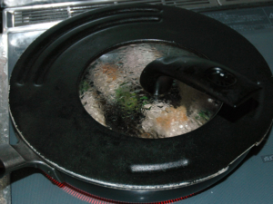 ⑦肉の両面に焼き色が付いたら、蓋をして、弱めの中火で2~3分焼きましょう。