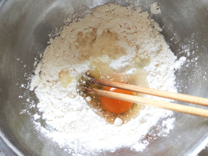 ![]() ②ボールに水と卵を加え、全体に粉っぽさがなくなるまで混ぜましょう。 |