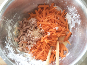 ![]() ④ボールに切ったにんじん、ほんだし、シーチキンを汁ごとも加え、全体になじむまでよく混ぜましょう。 |
