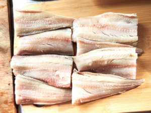 ![]() ①ホッケは、それぞれ切り身を2等分にします。 |