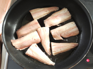 ![]() ②フライパンに少し多めに油(分量外)を引き、ほっけを炒めましょう。 (ほっけの形が崩れるのが嫌な場合は、一旦フライパンから取り置いてください。) |