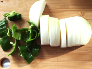 ![]() ④玉ねぎは皮をむいて薄切りに、ピーマンは種とヘタを取り食べやすい大きさに切ります。 |