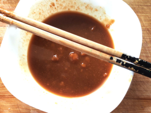 ![]() ⑥蒸し焼きにしている間に、器に砂糖、みそ、みりん、醤油を加え、良く混ぜてたれを作ります。 |