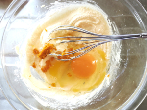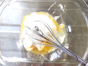 ![]() ③ボールに、卵、オレンジの皮のすりおろし、オレンジ果汁小2を加え、良く混ぜ合わせます。 |