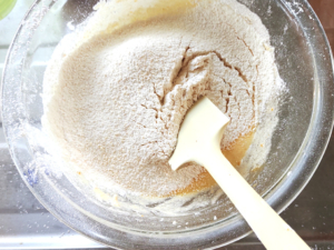 ![]() ④薄力粉、ベーキングパウダー、アーモンドパウダーを一緒にふるい入れ、ゴムベラでさっくりと混ぜましょう。 |