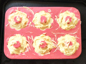 ![]() ⑥シリコン型に刷毛で薄く油(分量外)を塗ってから、生地をスプーンで等分にすくい入れます。 |