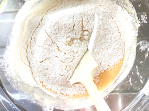 ![]() ④薄力粉とベーキングパウダーを合わせたものを、ボールにふるい入れ、ゴムベラでさっくりと混ぜます。 ⑤粉っぽさがなくなればOK。 |