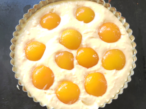 ![]() ⑥冷蔵庫からパイ皿を取り出し、生地を均等に流し入れます。 ⑦アプリコットの缶詰は汁気を切り、11~12個のアプリコットを均等にケーキに乗せましょう。 (ハーフカットタイプを使っています。) |