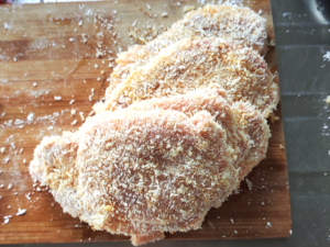 ![]() ②豚肉に薄力粉→溶き卵→パン粉の順に衣をつけます。 |