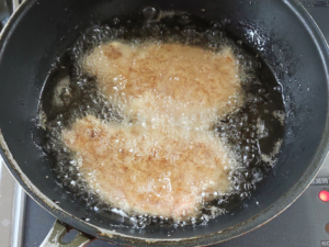 ![]() ③180度の油で、両面を3分ずつ、きつね色になるまで揚げましょう。 (肉の厚みにもよるので、両面がきつね色になるのが目安です。) |