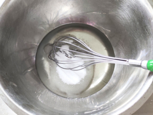 ![]() ①ボールにサラダ油と砂糖を入れて、白くなり砂糖のざらざら感が消えるまでしっかりと混ぜます。 |
