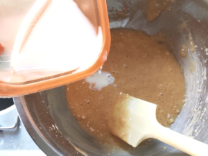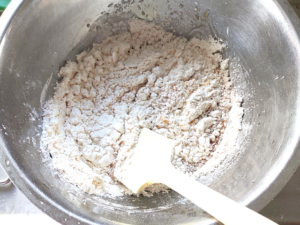 ![]() ⑤牛乳も半量加え、切るように混ぜます。 ⑥同じ作業を繰り返して、生地が滑らかになればOK。 |