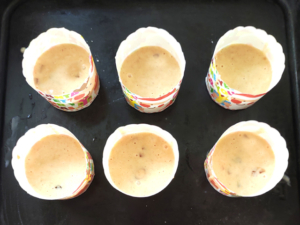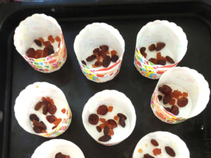 ![]() ⑦マフィンカップにラム酒漬けドライフルーツを均等に入れます。 |