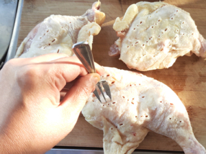 ![]() ①チキンレッグには所々フォークで穴を開け、味がしみやすくします。 |
