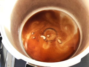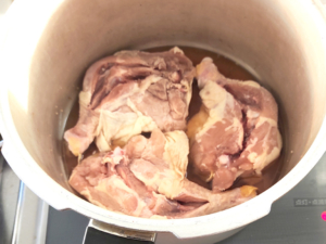 ![]() ②圧力鍋に、カンタン酢、みりん、生姜、にんにく、醤油を入れて混ぜ、一旦煮立たせましょう。 |
