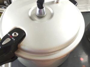 ![]() ④蓋をして強火にかけ、重りがカタカタしだしたら、火を弱火にして、10~12分加圧します。 ⑤加圧が終わったら、蓋が取れるまで自然放置しましょう。 |