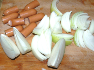 ![]() ①玉ねぎは8~10分割のくし形に切り、ソーセージは長さ半分に切ります。 |