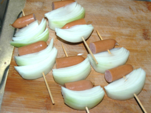 ![]() ②竹串に玉ねぎとソーセージを交互に刺しましょう。 |