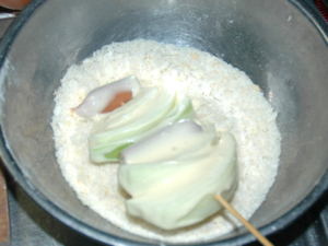 ![]() ④串に刺した玉ねぎとソーセージにバッター液をつけ、パン粉をまぶします。 |