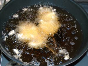 ![]() ⑤180~190度の油で、串カツをきつね色になるまで揚げます。 |