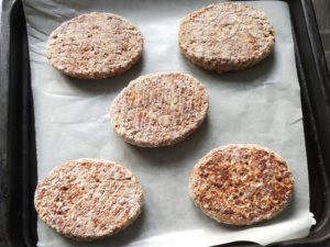 ![]() ①オーブンの天板にオーブンシートを敷き、冷凍ハンバーグを解凍せずに乗せます。 |