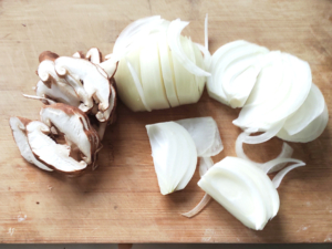 ![]() ②玉ねぎは皮をむいて薄切りに、椎茸は軸を取って薄切りにします。 |