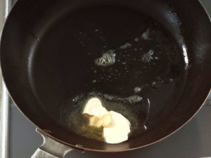 ![]() ③フライパンを加熱し、マーガリンを溶かします。 ④玉ねぎと椎茸を加え、玉ねぎがしんなりするまで炒めましょう。 |