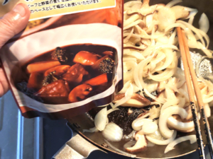 ![]() ⑤ドミグラスソース(今回はCOOP製を使用)をフライパンに加えます。 |