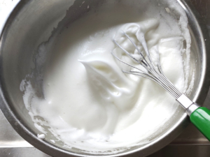 ![]() ①卵白に砂糖を一つまみ加えて泡立て始め、途中二回に分けて砂糖を加え、ピンと角が立つまで泡だててメレンゲを作ります。 |