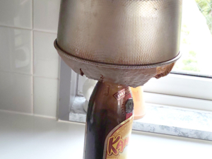 ![]() ⑪ケーキが焼けたら、すぐに逆さにして、瓶などに挿し、このまま2時間以上放置します。 |