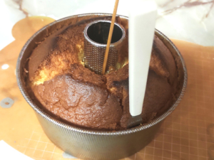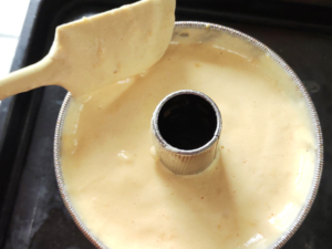 ![]() ⑧型に生地を流しいれ、筒部分を押さえて、二回ほどトントン落として空気を抜きましょう。 ⑨箸をケーキ内で、くるくる回しながら一周させ、中の気泡も取り除きます。 |
