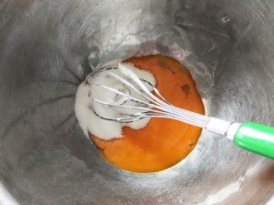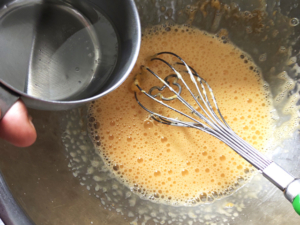 ![]() ②卵黄のボールに砂糖を加えて泡立て、白っぽくとろりとするまで泡だてましょう。 |