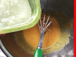 ![]() ③すりおろした梨を大1ずつボールに加え、その都度よく混ぜ合わせます。 |