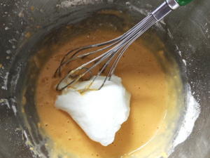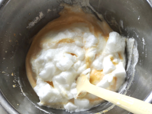 ![]() ⑦卵黄のボールにメレンゲを加え、ゴムべらに持ち替えて、さっくりと練らないように混ぜます。 |