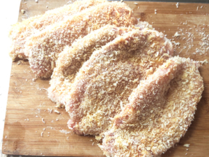 ![]() ②肉に、小麦粉→溶き卵→パン粉の順に衣をつけます。 |