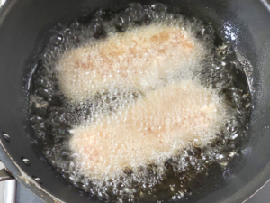 ![]() ③180度の油で、片面3分ずつ揚げましょう。 (肉の厚みによって揚げ時間は異なります。) ④きつね色に揚がったら、油を切っておきます。 |