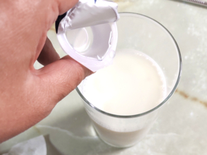 ![]() ⑤コップを用意し、牛乳とガムシロップを加えてよく混ぜます。 ⑥ゼリーを軽く砕いたものも加え、軽くかき混ぜましょう。 |
