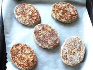 ![]() ①オーブンの天板にオーブンシートを敷き、冷凍ハンバーグを解凍せずに乗せます。 |