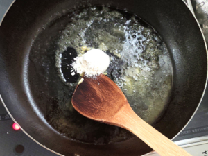 ![]() ②フライパンを火にかけ、弱火でマーガリンを溶かします。 |