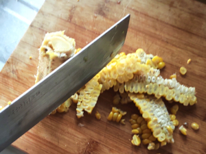 ![]() ①コーンは、縦に包丁を入れて、バラバラにほぐします。 |