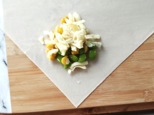 ![]() ④春巻きの皮を1枚ずつはがし、三角の頂点を下にしたら、手前の方に枝豆10~12粒、コーン10粒ほど、チーズをひとつまみほど乗せます。 |