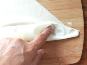 ![]() ⑤下の頂点から少しきつめにくるくると巻き、半分まで来たら、両端に水溶き小麦粉を多めに塗ります。 ⑥両端を中央で折り返し、更にくるくると巻きましょう。 |