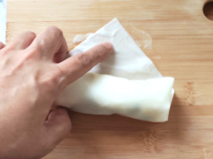 ![]() ⑦先端の三角の頂点に来たら、また水溶き小麦粉を多めにつけ、たたむようにしてくっつけたら春巻きはOK。 ⑧個数分繰り返します。 |