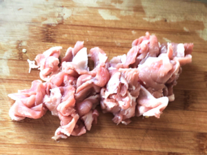 ![]() ②豚こまは食べやすい長さに切りましょう。 |
