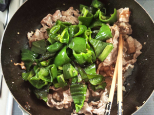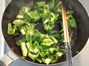 ![]() ③フライパンに多めに油(分量外)を引き、ピーマンが軽くしなっとするまで炒めたら、一旦取り置きます。 |