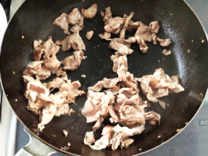 ![]() ④同じフライパンで豚こまを焼き、白くなり完全に火が通るまで炒めましょう。 |