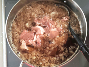 時間をかけて煮ると、豚肉が固くなることがあります。