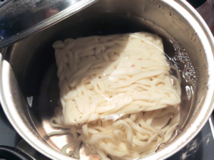 ![]() ⑤別の鍋にお湯を沸かし、うどんをパッケージの時間通りにゆでます。 |