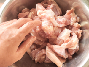 ![]() ②鶏肉をボールに入れ、塩と酒をもみこみ、10分ほど置きましょう。 |