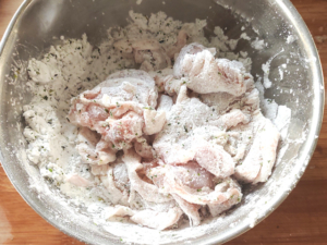 ![]() ④鶏肉にのり塩の衣を薄くまぶしましょう。 |